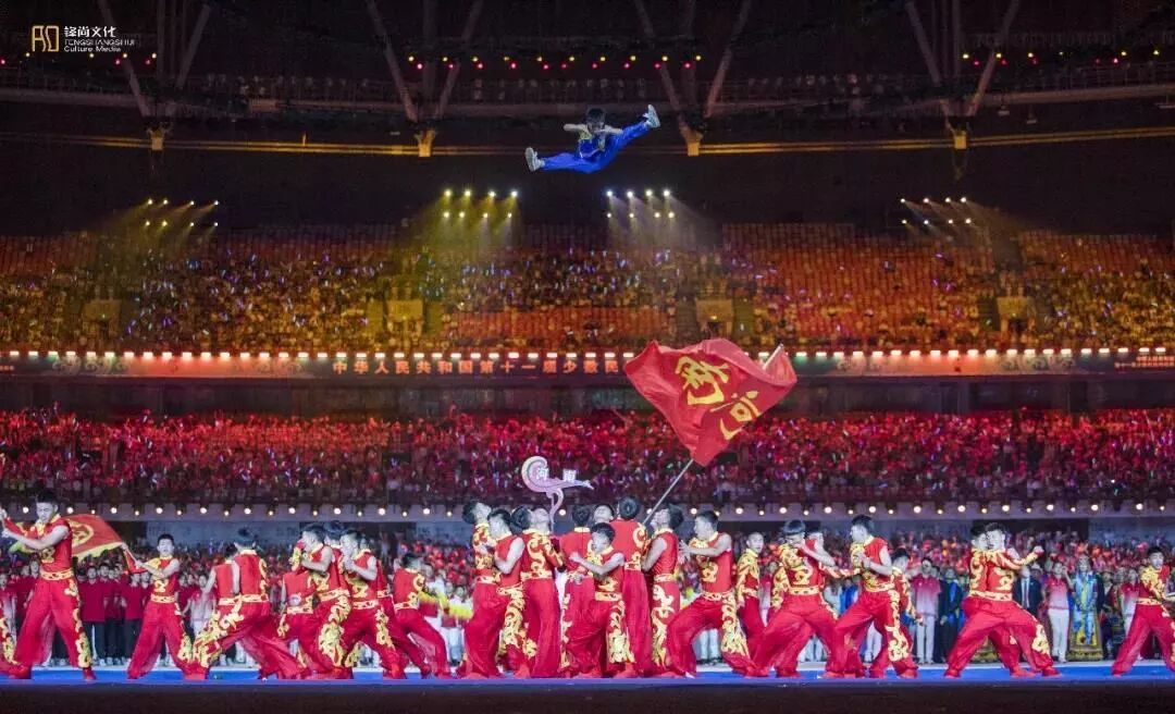 在升国旗、唱国歌等环节之后,开幕式进入到文艺展演环节,演职人员超过8000人。本次开幕式文艺展演共分“礼赞中华”“出彩河南”“拥抱梦想”三大篇章。展现了多项少数民族非物质文化遗产表演项目,其中包括舒展奔放的蒙古“长调”、“众低独高”的侗族大歌、新疆《十二木卡姆》3个世界级非物质文化遗产,以及“陈氏太极”、藏族《卓舞》等2个国家级非物质文化遗产的表演。